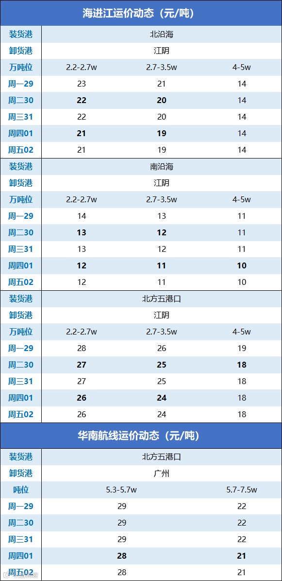 市场商谈氛围略有好转,沿海散货运价底部持稳。受冷空气影响,北方港口因天气因素封航增多,影响运力周转,部分刚需拉运需求集中释放,市场货盘少量增加,但煤价下行,日耗下滑的情况仍存,市场观望情绪仍多,运价承压,上行动力有限,维持底部稳定运行。