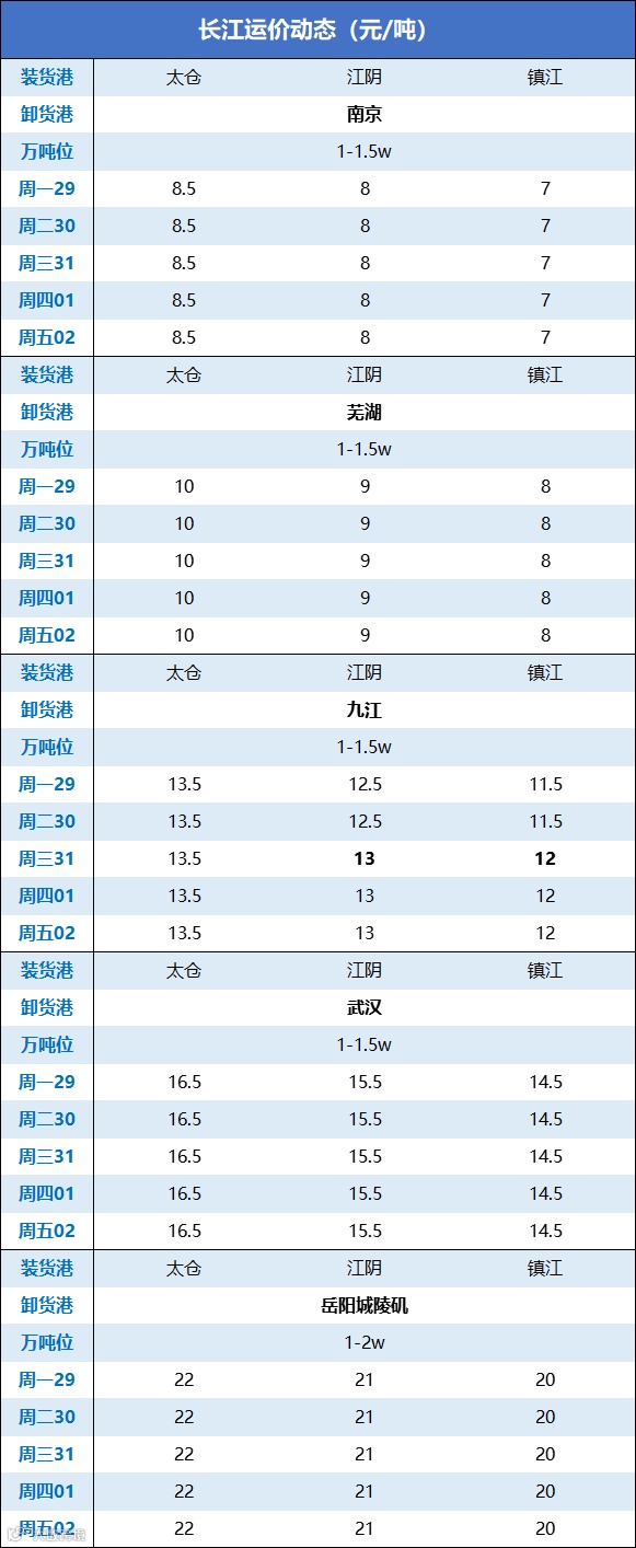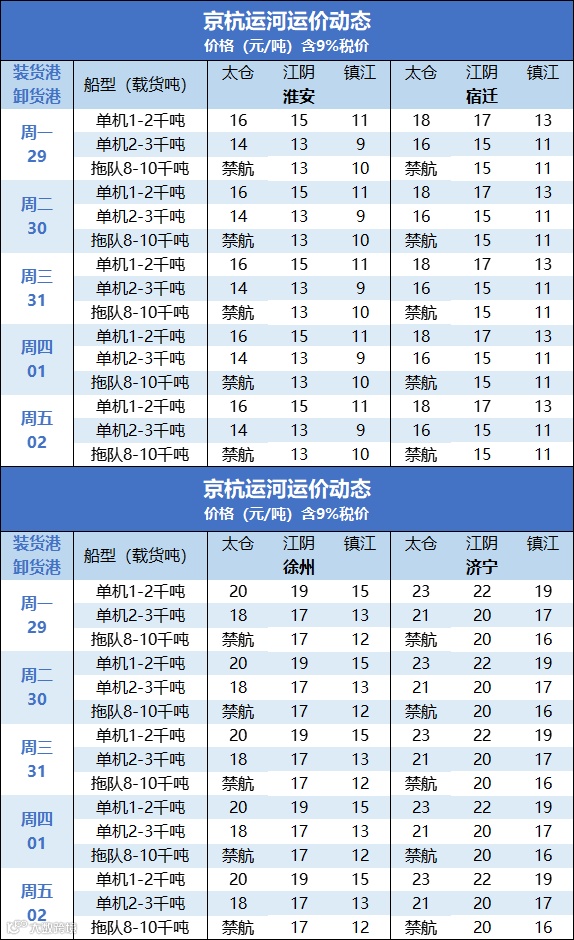 周五镇江到淮安单机1-2千吨的运价为11元/吨,2-3千吨的运价为9元/吨,拖队8-10千吨的运价为10元/吨;