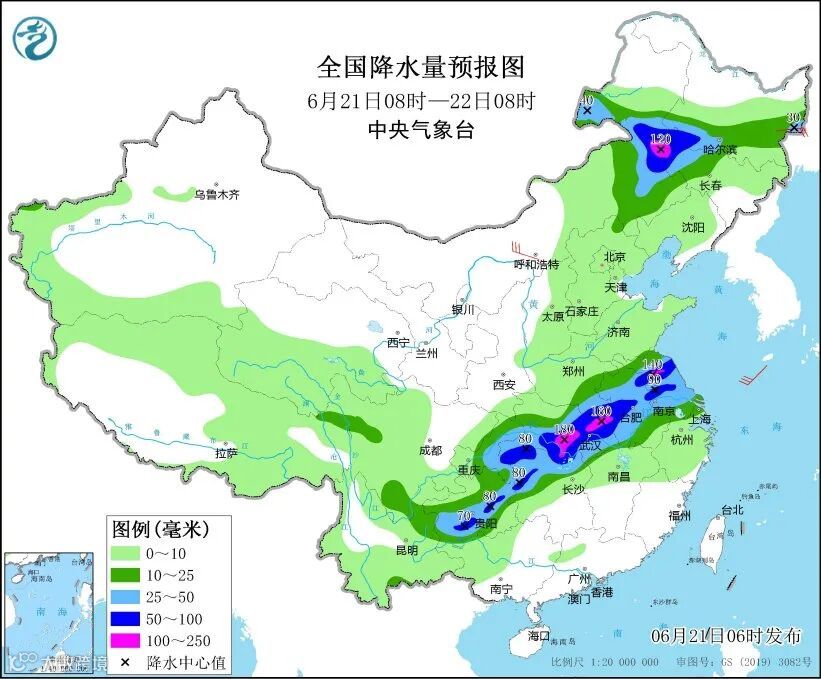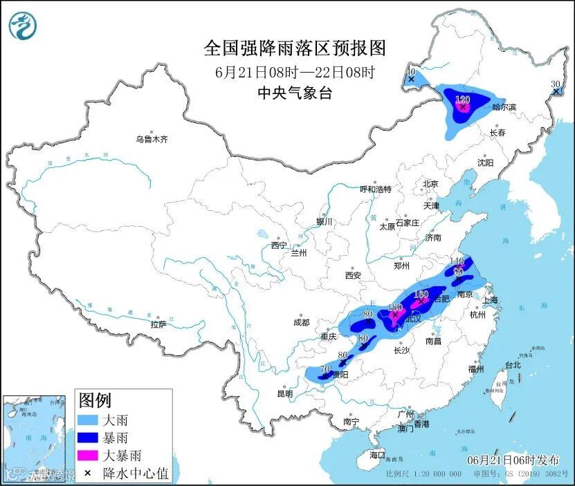 预计,6月21日08时至22日08时,江淮大部、江汉大部、河南南部、湖南北部和西部、重庆东部、贵州西南部和中部以及内蒙古东北部、黑龙江西南部和东部、吉林西部等地部分地区有大到暴雨,其中,湖北东部和南部、安徽西部、江苏北部、内蒙古东北部、吉林西部等地局地有大暴雨(100~180毫米)。上述部分地区伴有短时强降水(最大小时降雨量30~60毫米,局地可超过80毫米),局地有雷暴大风等强对流天气。中央气象台6月21日06时继续发布暴雨黄色预警(见图1)。