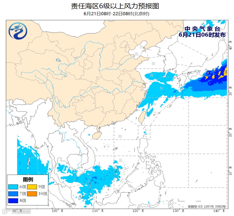 预计,21日白天至23日夜间,黄海南部海域、东海大部海域、台湾海峡、台湾以东洋面、巴士海峡、南海大部海域将有5~7级、阵风8级的西南风或东南风,其中东海北部部分海域的风力可达8~9级、阵风10级。