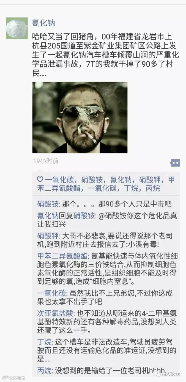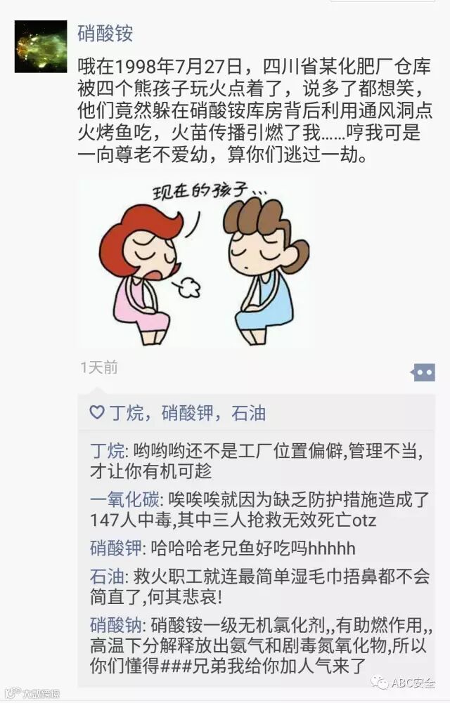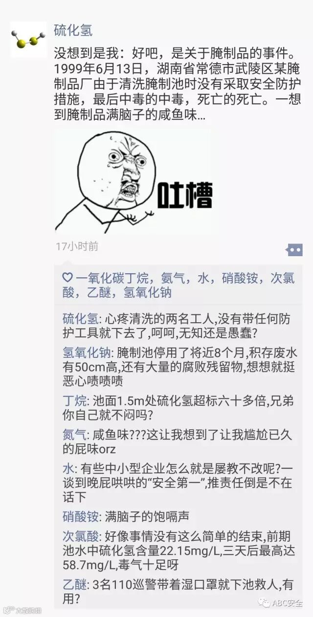 圈子里上危化品们各种吐槽,对人类不安全的对待方式进行了严厉批判。