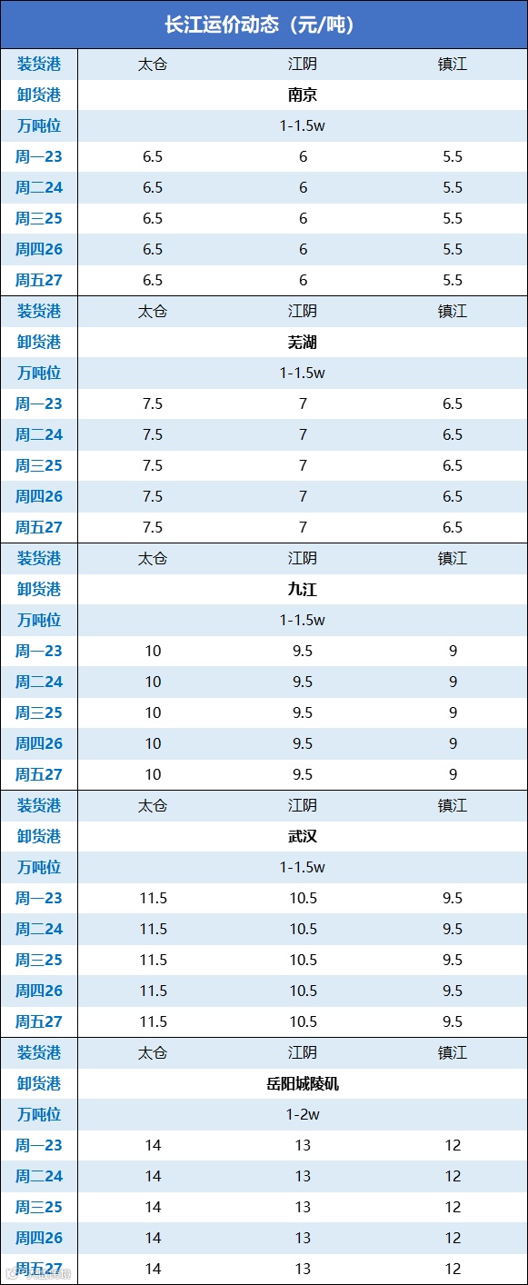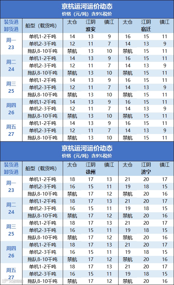 周五镇江到淮安单机1-2千吨的运价为9元/吨,2-3千吨的运价为7元/吨,拖队8-10千吨的运价为10元/吨;