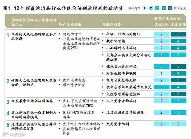 近几年快消品行业逐渐褪去往日的光环,其有机增长速度在扣除并购、汇率和通胀等影响后仅有2.7%。为什么传统的价值创造模式在这个时代无法继续带动增长?麦肯锡通过对全球消费品行业的深入研究后发现:12个以技术驱动的颠覆性趋势正在或即将打破市场格局,导致传统模式失灵(见图1)。