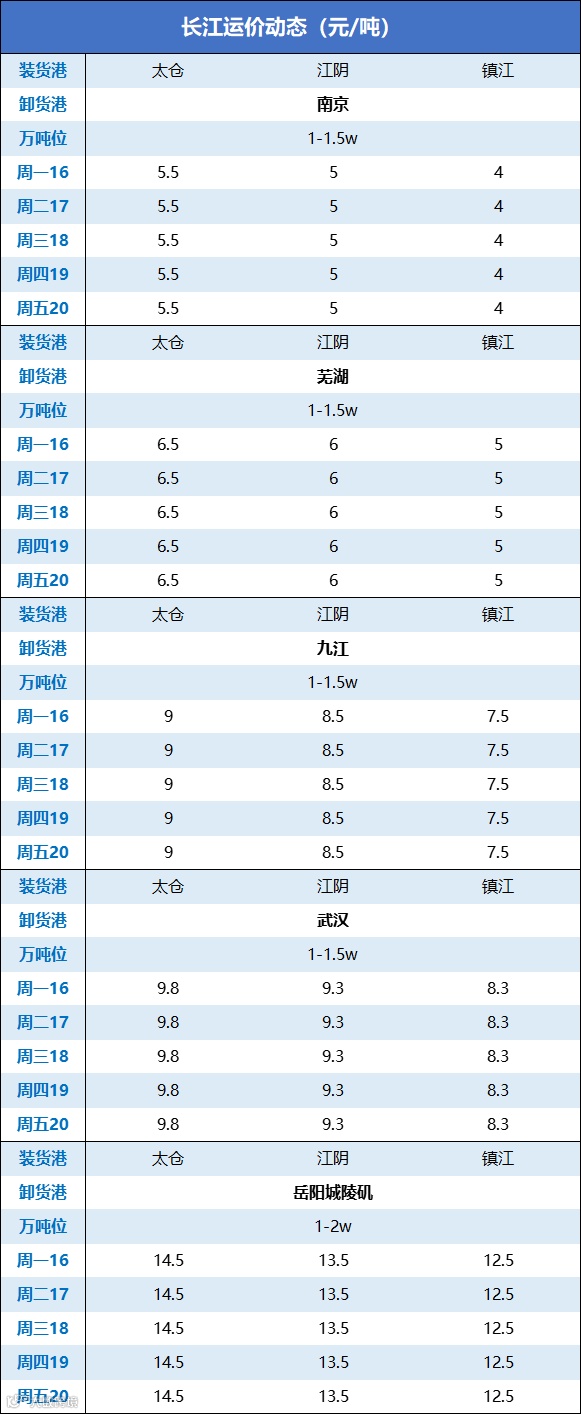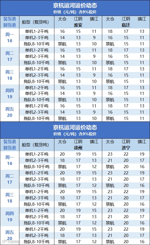 周五镇江到淮安单机1-2千吨的运价为11元/吨,2-3千吨的运价为9元/吨,拖队8-10千吨的运价为10元/吨;