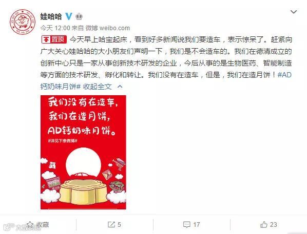 之后,娃哈哈在其官方微博上正式作了声明:“今天早上哈宝起床,看到好多新闻说我们要造车,表示惊呆了。赶紧向广大关心娃哈哈的大小朋友们声明一下,我们是不会造车的。我们在德清成立的创新中心只是一家从事创新技术研发的企业,今后从事的是生物医药、智能制造等方面的技术研发、孵化和转让。我们没有在造车,但是,我们在造月饼!”