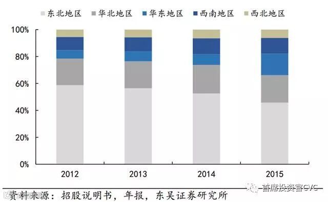 传统东北、华北大区的营收占比逐年下降,公司向异地扩张的战略思路清晰;之前市场有过异地扩张成功与否的担忧,实践上来看,公司成功证明扩张的成功,东北营收占比2017年保持40%以下,但依旧保持18%以上的高增速;