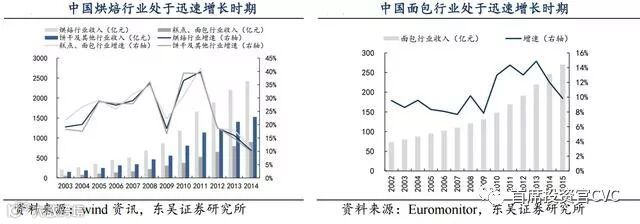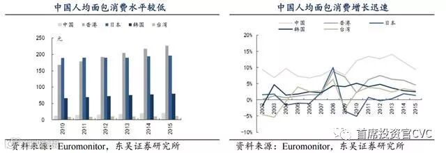 与中国饮食相似的其他东亚国家,人均面包消费远远高于中国。市场容量尚有4倍-10倍的提升空间;从增速上来看,10%的增速水平下,15年以上的成长周期可期;