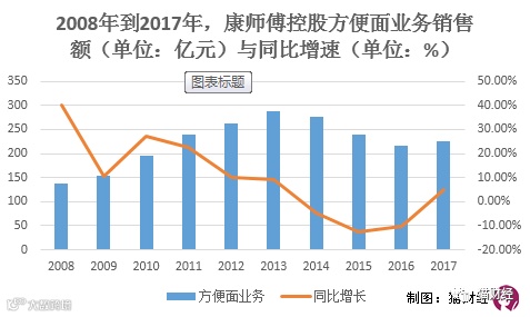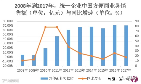 猫妹统计了2008年到2017年,康师傅控股与统一企业中国方便面业务销售额的变化情况与各期同比增速。