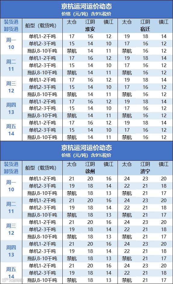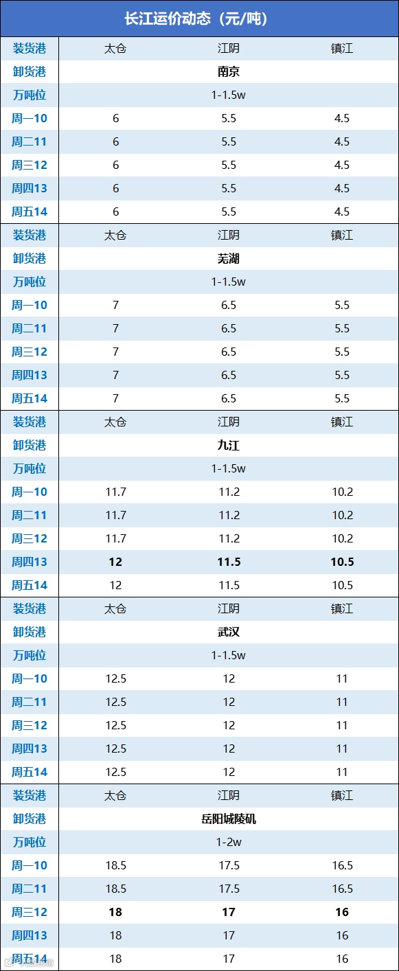 周五镇江到淮安单机1-2千吨的运价为12元/吨,2-3千吨的运价为10元/吨,拖队8-10千吨的运价为11元/吨;