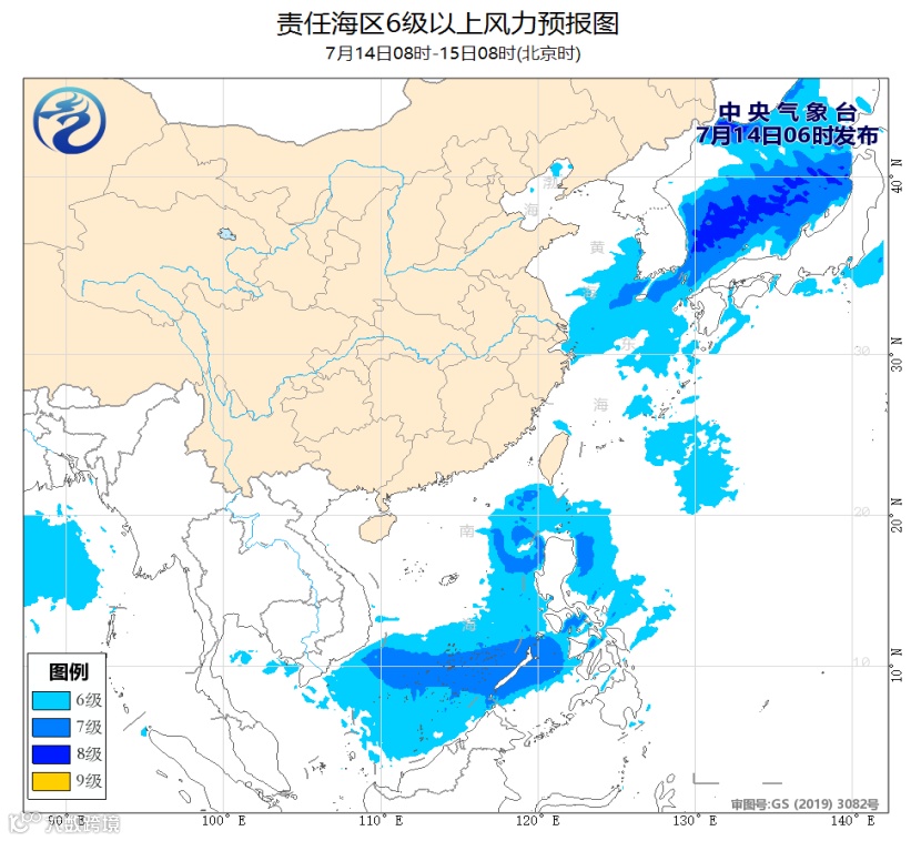 14日白天至16日夜间,受西南季风和南海热带系统影响,黄海东南部海域、东海大部海域、南海大部海域、巴士海峡将有6~7级、阵风8级风,其中南海北部和中部部分海域风力可达8~9级、阵风10级。