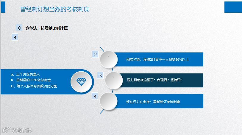 另外两个人虽然没有拿到很多奖金,但可能也非常努力,但是因为各种原因,就也会造成这个团队不稳定。这个压力回到老板,这个时候你是坚持还是不坚持?我用过这个方法,我告诉大家,这个不用坚持了。团队当中贡献大小,跟他的能力、努力有关,也和你分配的渠道产品结构,和整个的公司资源分配有关。好在权利在老板这里,老板可以重新制定考核。
