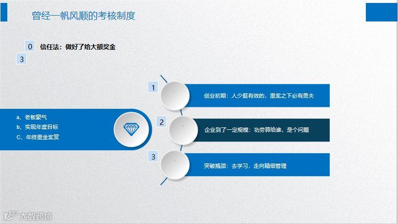 有的老板说等公司做大以后,再做分红考核可以吗?自己评估,我个人觉得越早越好。假如以前我学习更多,摸索的路会更短,就会发展的更快。