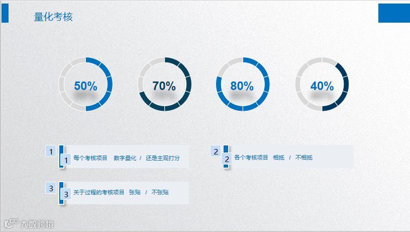 量化考核,考核还是要量化,要避免或者减少主观打分进行考核。有一个朋友跟我说,他们公司主要是主管、经理打分算考核,越来越不好用了。二是考核项目尽量不要相抵。三是过程的考核还可以张贴出来。在坐的老板公司有多少把过程考核张贴出来,可能比较少。过程当中的销售进度,陈列进度,排名等张贴出来,在员工心里产生一些反应。