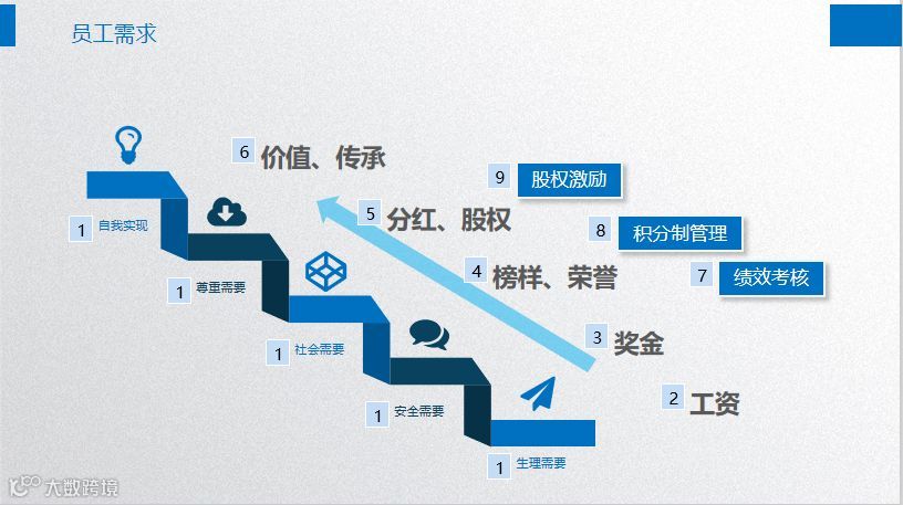 员工的需求由马斯洛的需求理论来讲,有生理需求,安全需求,社会需求,尊重需求,自我实现需求。老板有这个需求,员工也有这个需求,你实现你的需求,同时怎么实现他的需求呢?