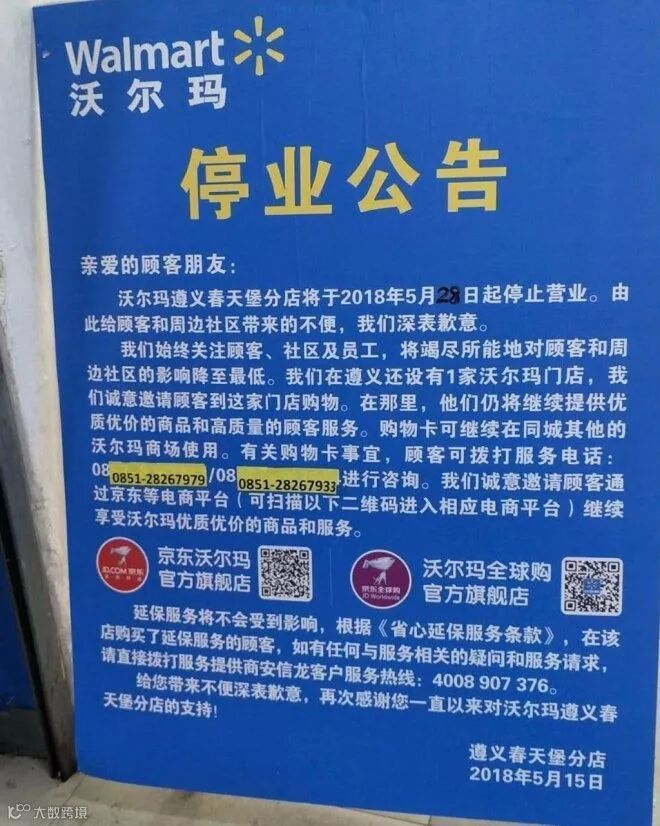 而《联商网》梳理发现,在过去三个月的时间里,沃尔玛已经相继关闭了11家门店。其中,3月份关闭两家,分别是深圳南新店和绍兴柯桥店;4月份关闭两家,分别是通辽和平路店和南京水西门大街店;5月份关闭三家,分别是唐山新华东道分店、芜湖中山北路分店和遵义春天堡分店;6月份到目前为止已经关闭四家,分别是上海宝山一二八纪念路店以及今天关闭的三家店。