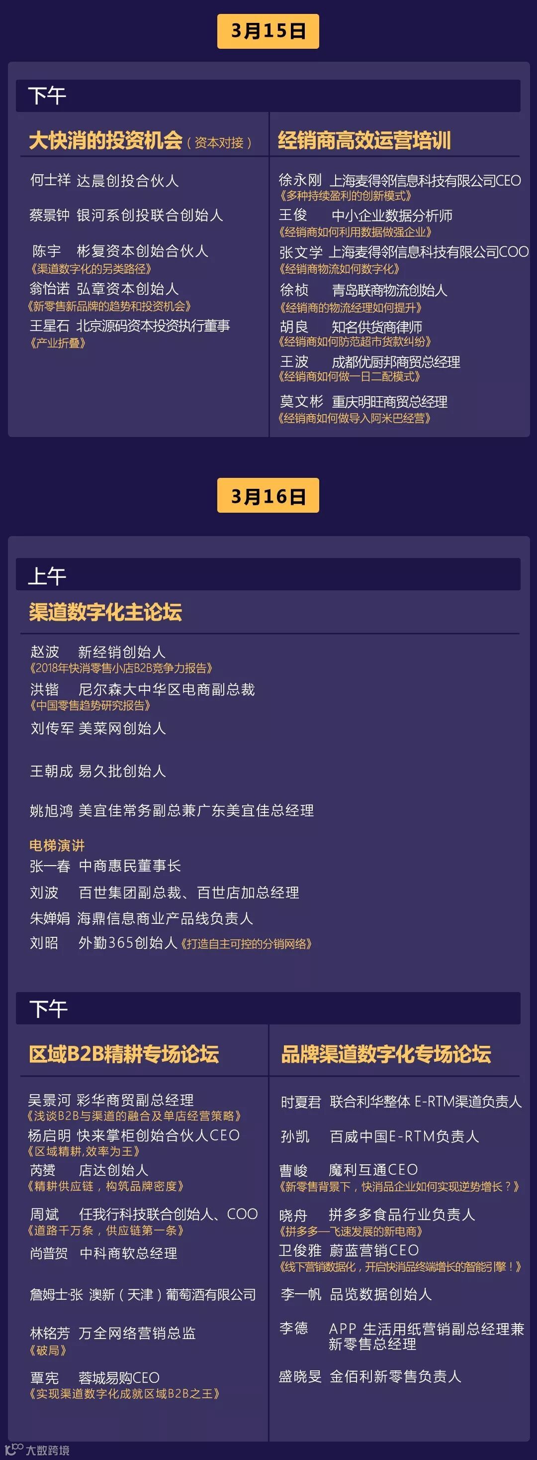 相较于往届会议,本次峰会将全面升级,除原有的渠道创新、城配物流、经销商转型等话题以外,还新增了新营销案例、IP+快消赋能、社区团购、创新零售等多场平行论坛,通过三天十场高密度高质量的专家分享交流,相信每个品牌商、经销商都能够学习到最新的商业模式,专家观点,落地的方法,为自身2019年破局找到新工具和方法,重回高速增长的轨道。