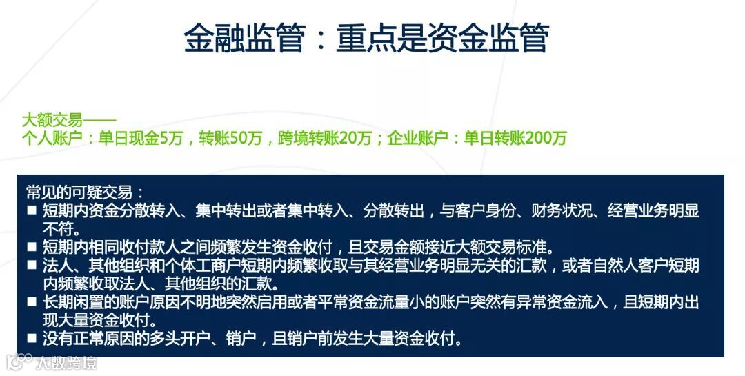 实际上,最近这几年,银行在资金监管方面的动作比税务还要频繁。从2016年,央行颁布了大额交易和可疑交易的管理办法之后,资金监管的范围越来越大。比如大额交易,原来是一天20万叫大额,现在一天5万就是大额。大额有什么作用呢?央行有个反洗钱中心,全国商业银行对于大额交易要上报到这个反洗钱中心,换句话说,个人取现5万就要上报。当然,只是上报,也不意味着什么,如果需要到银行取个几十万,该去还是要去,这个只是代表国家金融监管已经严格到这种地步了。再比如,可疑交易,很多以前常用的大额转账、大额取现、对私支付等,现在经常会接到银行的电话,问这笔钱是干什么用的,或者资金来源是什么。其实这个,就是系统监控的风险,需要当地网点进行上报的。再举个例子,以前注册个公司,一般都不用法人去,或者顶多税务要去,现在很多银行要求法人必须去,要现场签字,甚至财务负责人也要去。另外,公司设立的地址,银行也要上门核查,是否真实存在。这些要求,实际上都是金融机构加强银行开户管理的具体措施。