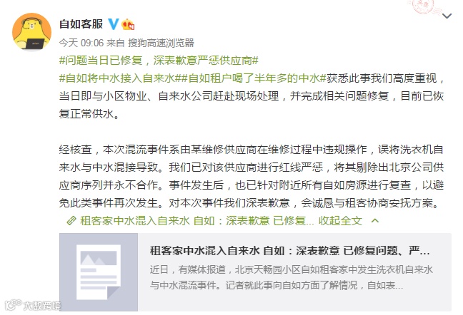 经核查,这次混流事件系由某维修供应商在维修过程中违规操作,误将洗衣机自来水与中水混接导致。自如已对该供应商进行红线严惩,将其剔除出北京公司供应商序列并永不合作。事件发生后,也已针对附近所有自如房源进行复查,以避免此类事件再次发生。对本次事件我们深表歉意,会诚恳与租客协商安抚方案。