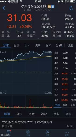 此消息一经传出,资本市场反应极为迅速。伊利股份盘中一度涨停。昨日伊利股票出现久违的大涨,盘中一度涨停,收盘价31.03/股,当日伊利股价上涨9.96%。