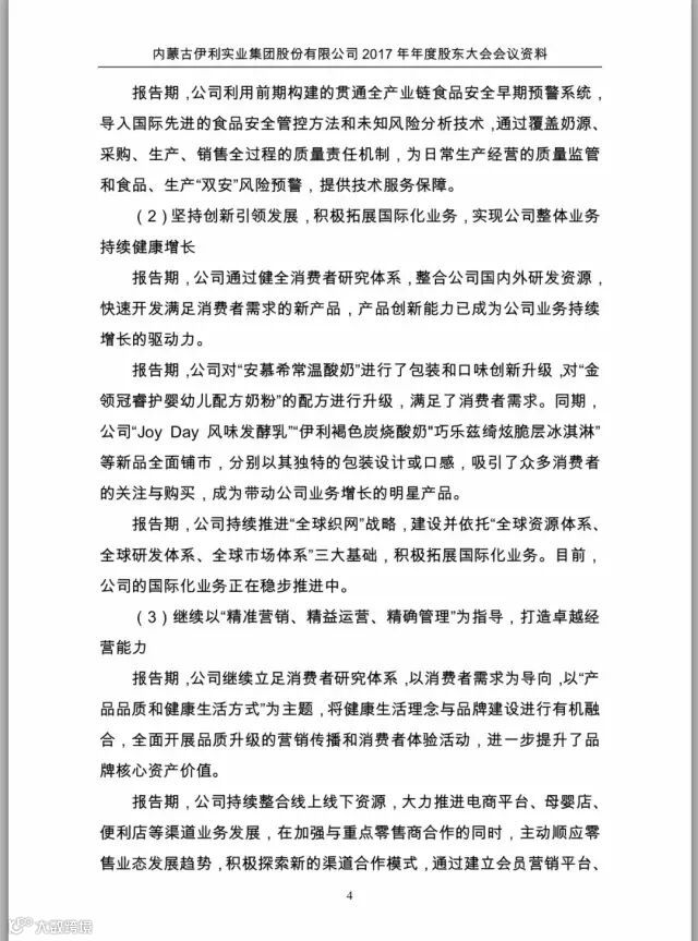 另据凯度消费指数显示,2017年,伊利持续稳居乳品市场占有率第一,2017年购买过伊利产品的消费者达13.5亿人次,消费者渗透率行业领先。实现了营业收入持续行业第一、净利润持续行业第一、综合市场占有率持续行业第一、消费者渗透率持续行业第一、净资产收益率持续全球乳业第一。