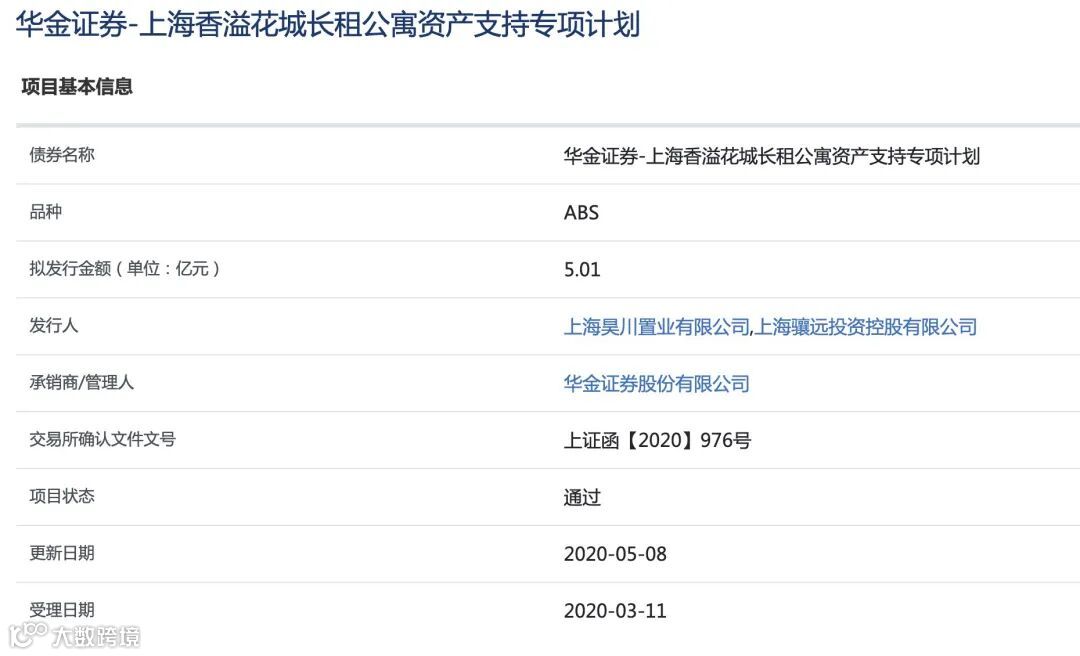 文件显示,华金证券-上海香溢花城长租公寓资产支持专项计划,发行品种为ABS,发行规模为5.01亿元,发行人为上海昊川置业有限公司,上海骧远投资控股有限公司,该公司实际控制人为融创中国。