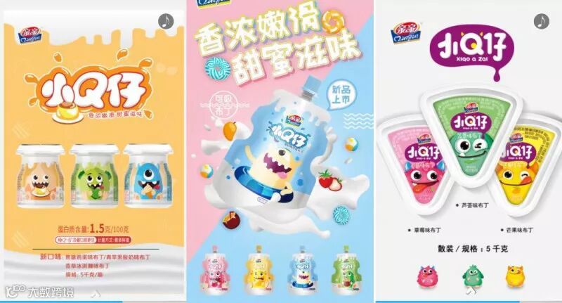 儿童系列包括“小Q仔”和“Q部落”,目标人群均为儿童,包装设计以萌萌的卡通形象为主,有草莓、芒果、酸奶等多种口味。