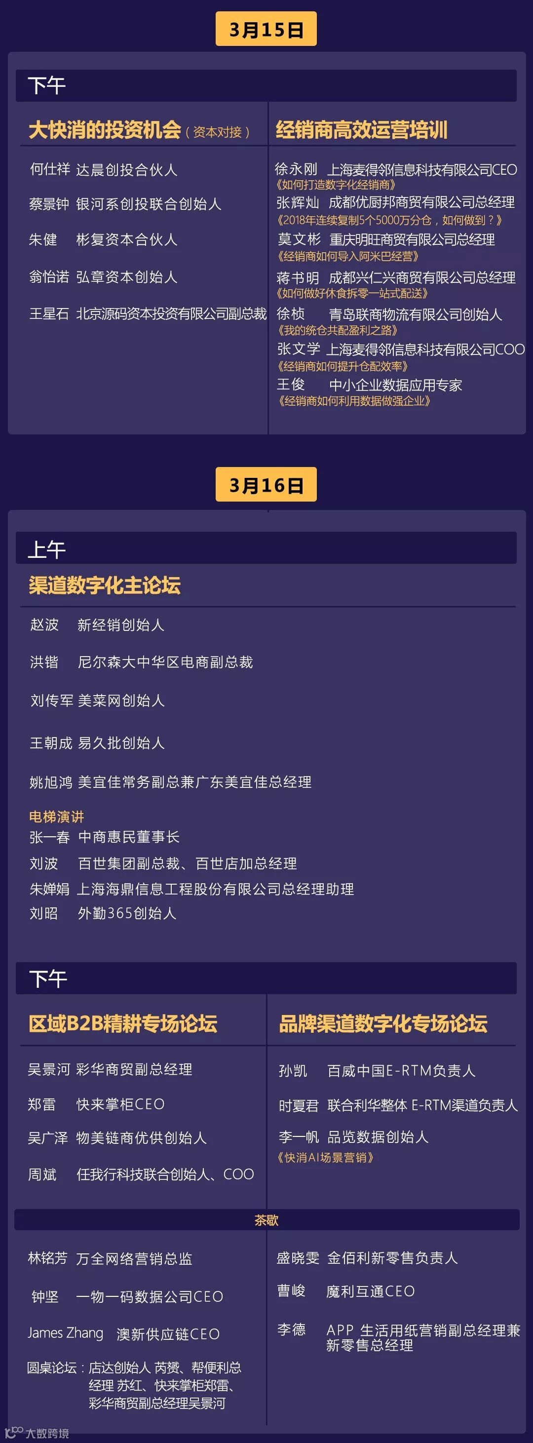 相较于往届会议,本次峰会将全面升级,除原有的渠道创新、城配物流、经销商转型等话题以外,还新增了新营销案例、IP+快消赋能、社区团购、创新零售等多场平行论坛,通过三天十场高密度高质量的专家分享交流,相信每个品牌商、经销商都能够学习到最新的商业模式,专家观点,落地的方法,为自身2019年破局找到新工具和方法,重回高速增长的轨道。
