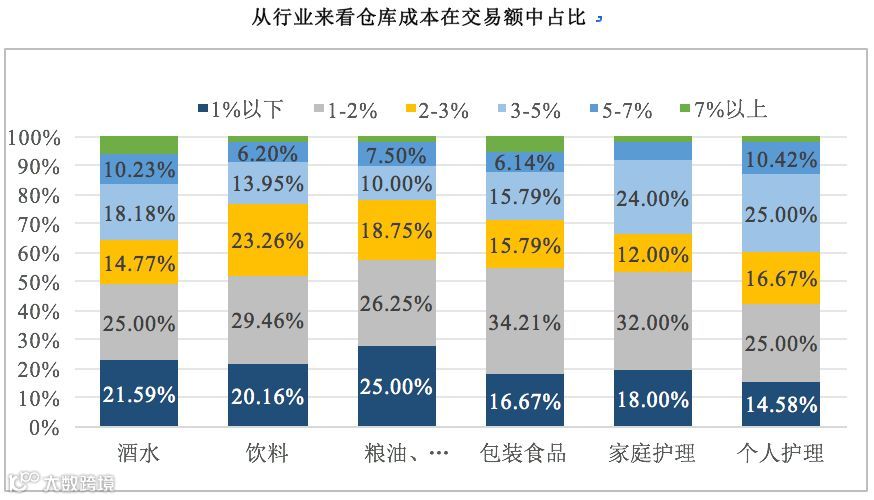 总体而言,销售规模越高,其仓储成本占总交易额越低。从不同品类看,家庭/个人护理品类的经销商相对数值较高,主要是因为品类的线下市场容量。其他品类整体数值虽有差异,但主要集中在1-3%。