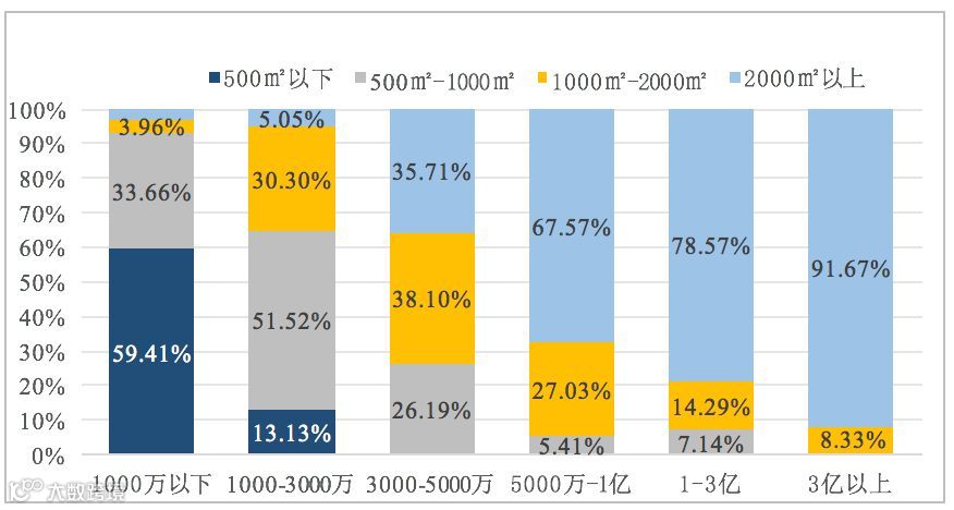 仓库使用面积与经销商的销售规模有显著关联。销售规模越大的经销商,使用仓储的面积也一般越大,年销售规模在1000万以下经销商大多使用面积在500㎡以下。销售规模在1000万-5000万之间因代理品类属性的差异,使用面积在500㎡到2000㎡之间为主。