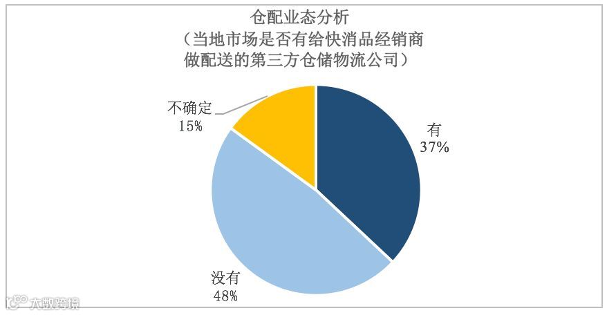 关于当地市场是否有给快消品经销商做配送的第三方仓储物流公司中,48%经销商确定区域内没有第三方仓配物流公司;37%有第三方,15%不确定。虽然第三方城市配送已经非常火热,但是对快消品行业整体渗透率还处在一个较低的水平上。