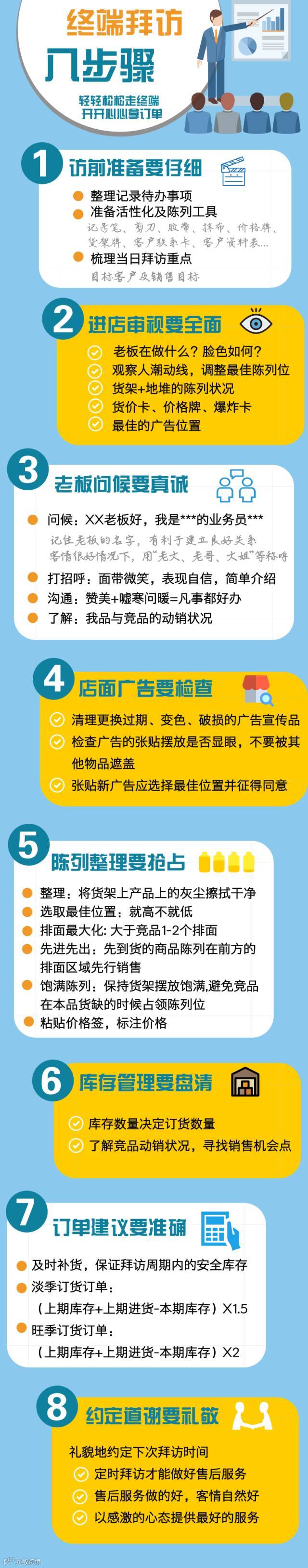 七定,定点、定期、定时、定人、定线、定销量、定标准,也就是打造终端系统化、标准化的管理模式以及严格的执行系统。经销商老板首先要对业务员进行销售目标的分解,业代拿着终端信息资料卡按照你每天计划的路线进行跟踪拜访店铺。并按照设定的终端拜访频率进行拜访,不同类型的店服务标准不同,提前设定好在每个终端店停留的时间,保证专业规划、有预期的催订单。最重要的是规定业代熟练掌握终端拜访八步骤和终端维护四大要点。没有标准做不大,没有标准做不好,没有标准做不强。
