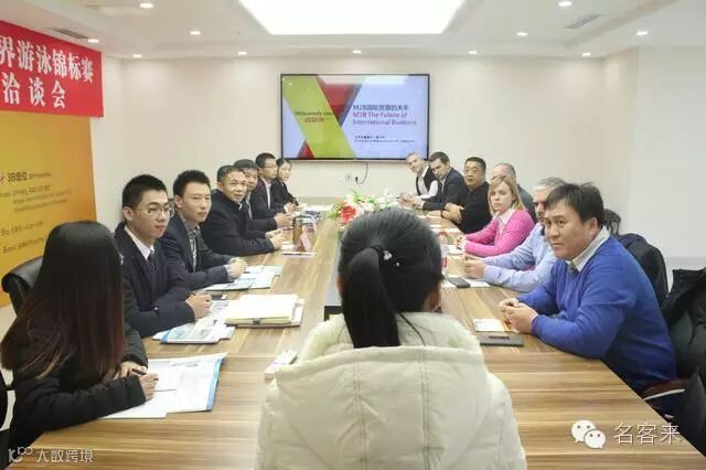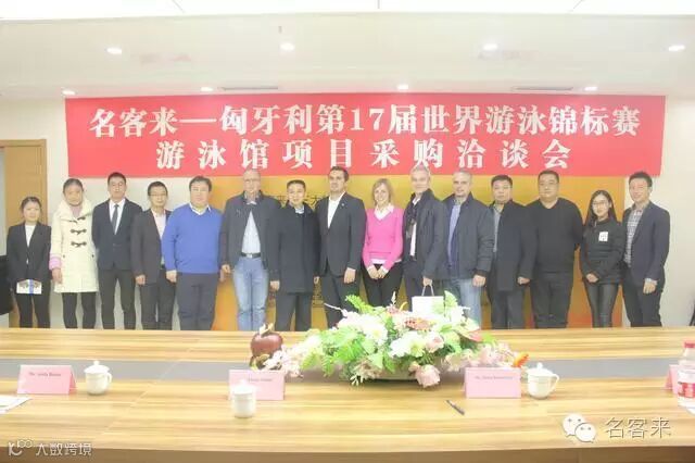 12月2日下午,名客来——第17届世界游泳锦标赛游泳馆项目采购洽谈会在名客来网总部隆重举行。国际泳联官员埃斯特•萨博、蒂博尔•基什瓦尔道、鲍瓦尔加,中欧商贸物流合作园区首席执行官吴江、总经理田红兵以及雷士照明等企业领导人出席会议。