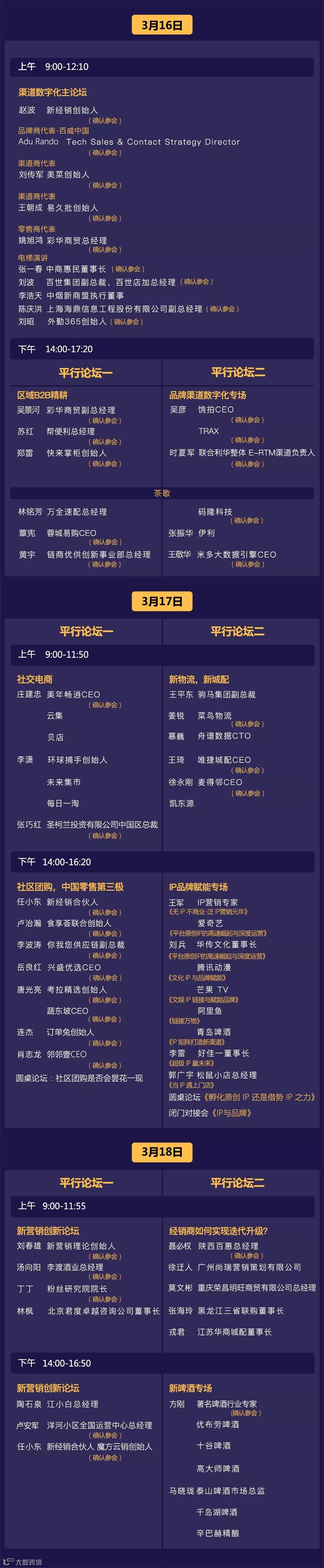 相较于往届会议,本次峰会将全面升级,除原有的渠道创新、城配物流、经销商转型等话题以外,还新增了新营销案例、IP+快消赋能、社区团购、创新零售等多场平行论坛,通过三天十场高密度高质量的专家分享交流,相信每个品牌商、经销商都能够学习到最新的商业模式,专家观点,落地的方法,为自身2019年破局找到新工具和方法,重回高速增长的轨道。