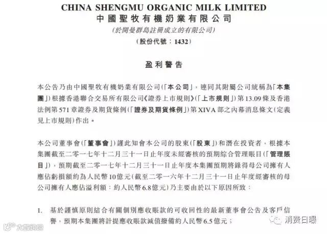 《消费日曝》小编了解,中国圣牧(01432)公布,2017年公司母公司拥有人应占亏损额约为人民币10亿元,2016年则是盈利6.8亿元。