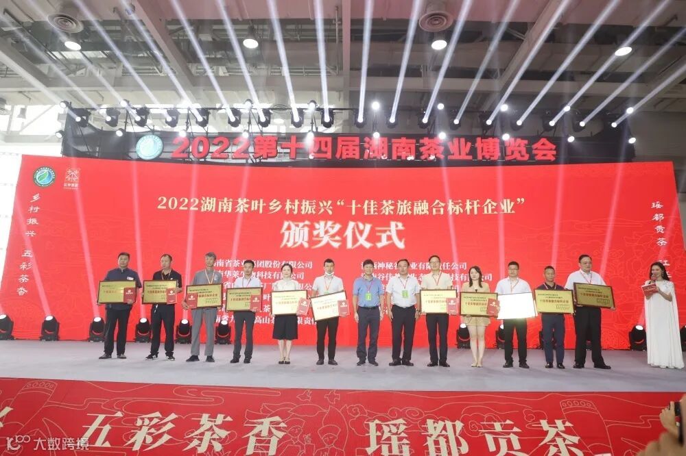 湖南茶业博览会是湖南茶叶产业每年一届的盛会,规模盛大,影响力深远。不仅全面展示了“三湘四水 五彩湘茶”的高质量发展局面,还集中讴歌表彰了在脱贫攻坚、乡村振兴战略中做出突出贡献的先进县市、领军企业和领跑品牌,彰显了湘茶人的社会责任和五彩湘茶的文化魅力。活动期间,我公司因在安化茶旅产业全面发展所做的积极贡献而被评为了“2022湖南茶叶乡村振兴十佳茶旅融合标杆企业”荣誉称号,副总经理曾卫军代表企业上台领奖。