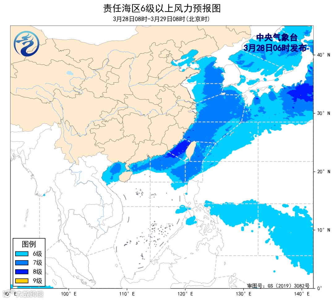 3月28日08时至29日08时,新疆北疆东部和南疆盆地、西藏中北部、青海西南部、甘肃河西、陕西北部、内蒙古中东部、华北北部等地的部分地区有5~6级风,局地风力可达7级及以上;黄海大部海域、东海大部海域、台湾海峡、台湾以东洋面、巴士海峡、南海北部海域、北部湾将有7~8级、阵风9~10级的大风。中央气象台3月28日06时继续发布大风蓝色预警。