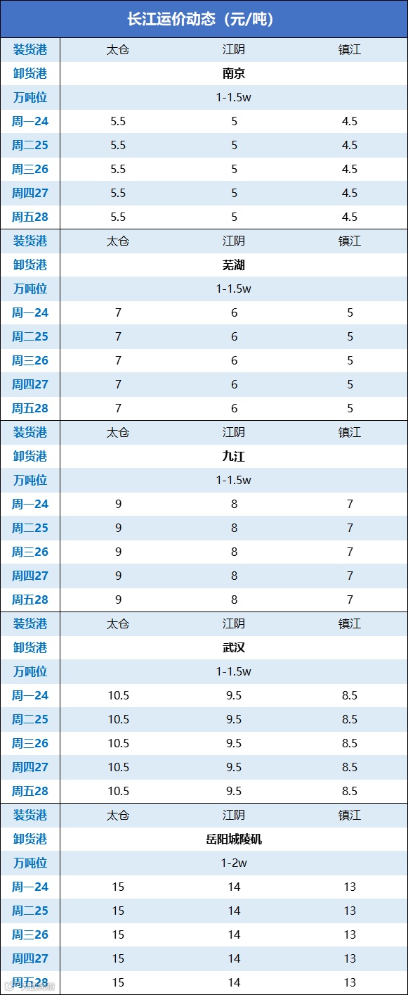 镇江到徐州单机1-2千吨的运价为15元/吨,单机2-3千吨的运价为12元/吨,拖队8-10千吨的运价为12元/吨;