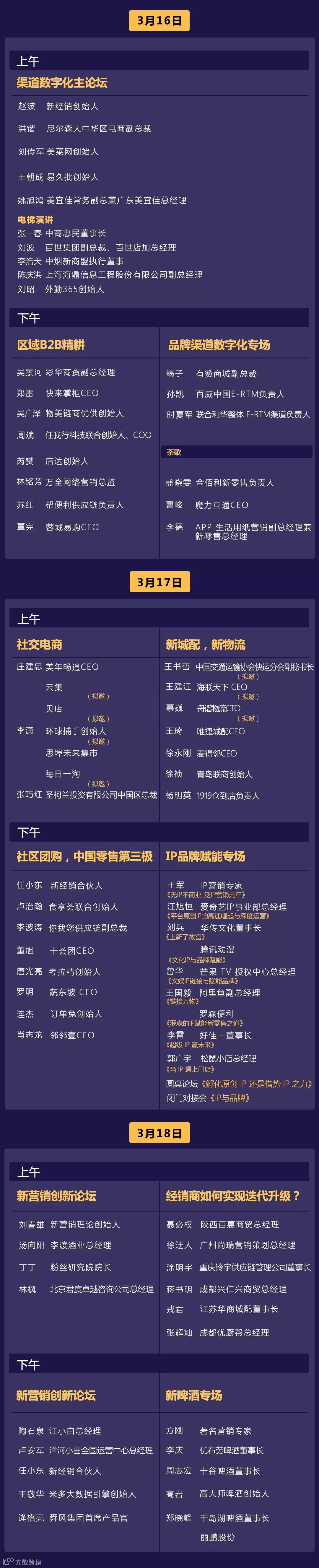 相较于往届会议,本次峰会将全面升级,除原有的渠道创新、城配物流、经销商转型等话题以外,还新增了新营销案例、IP+快消赋能、社区团购、创新零售等多场平行论坛,通过三天十场高密度高质量的专家分享交流,相信每个品牌商、经销商都能够学习到最新的商业模式,专家观点,落地的方法,为自身2019年破局找到新工具和方法,重回高速增长的轨道。