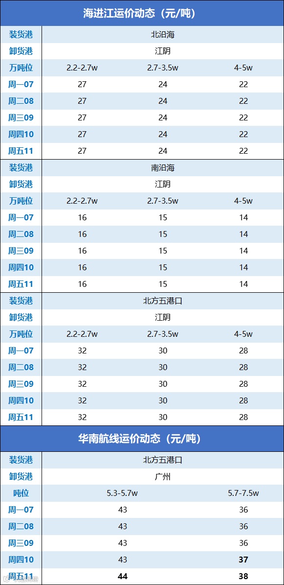 沿海市场运价走向分化。进江航线因货盘释放不足,市场供需处于弱势平衡, 华南航线运价小幅抬升;