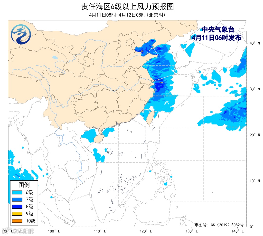 4月10日14时至11日02时,渤海出现了5~6级、阵风7级的偏南风,台湾以东洋面出现了5~6级、阵风7级的偏北风。东海西北部海域出现了能见度不足1公里的大雾。