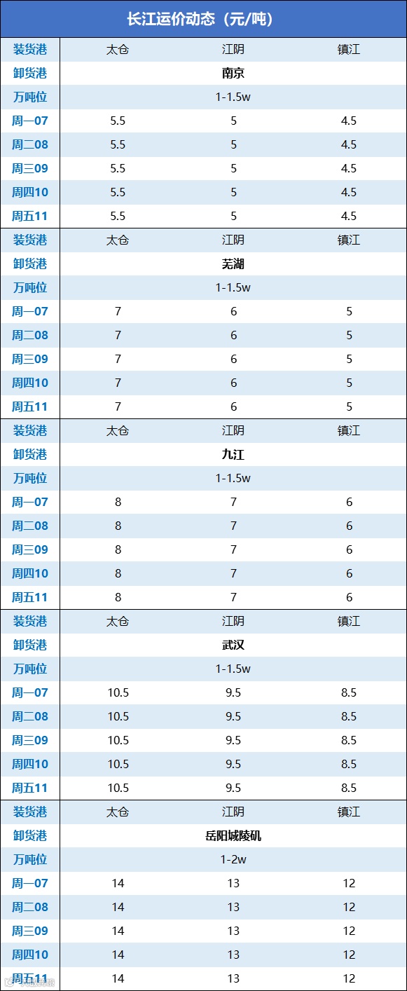 周五镇江到淮安单机1-2千吨的运价为12元/吨,2-3千吨的运价为9元/吨,拖队8-10千吨的运价为11元/吨;