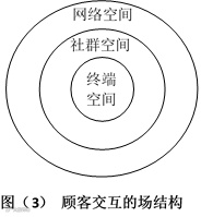 互联网背景下,企业与顾客交互的空间(场景)从传统的零售终端拓展为3个:一是互联网及移动互联网的虚拟世界;二是由目标顾客(包括老顾客以及潜在顾客等)所组成的社群;三是顾客实际体验的实体及物理“现场”(包括零售终端,也包括终端以及终端以外的现场)。这3个空间从顾客流量角度看,网络空间最为宽阔,社群空间次之,现场空间最小。它们由虚而实、由宏而微,相互关联和嵌合,构成了结构化的顾客交互之“场”。见图(3)。