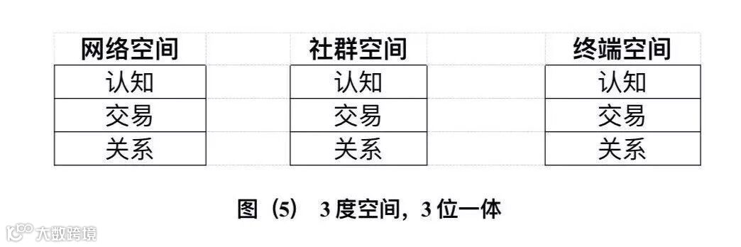 在3个空间内与顾客交互,同时实现认知、交易、关系3个功能,这是互联网时代一般性的营销模式(由笔者首创,详见《连接:顾客价值时代的营销战略》,北京,中国人民大学出版社,2018年1月,第162页至177页)。见图(5)。