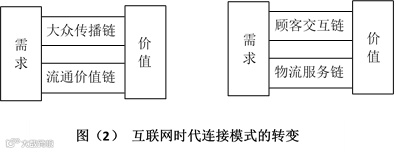 在移动互联网普及之前,传播之桥和流通之桥除零售终端场景两者叠合外,基本上是相互分离的:顾客认知和购买不同时发生;顾客认知和购买往往不在同一地点。到了移动互联网时代,由于顾客通过微信、APP、电子商务网站等多种中介,认知和购买(从供给方角度看,则是沟通与交易)可以在同一时空下发生(没有时滞,没有位差),因此传播链和流通链产生了融合。原先的大众传播链和流通价值链交融成为顾客交互链;而流通价值链中的物流要素独立出来成为物流服务链。见图(2)。