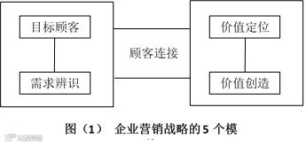 无论制造型企业还是零售型企业,营销战略都包含的5个模块或环节:目标顾客、需求辨识、价值定位、价值创造以及顾客连接。见图(1)。