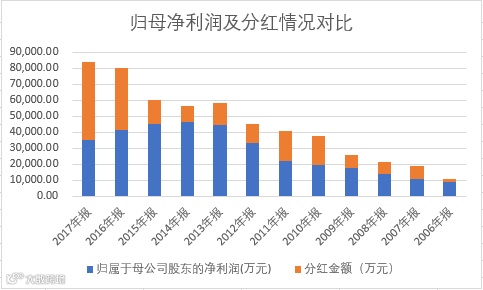 市界发现,业绩年年下滑,承德露露却非常热衷现金分红。自2006年起,承德露露几乎每年都拿出一半以上的利润进行分红。2006至2017年,公司累计实现归母净利润33.85亿元,累计分红20.05亿元。