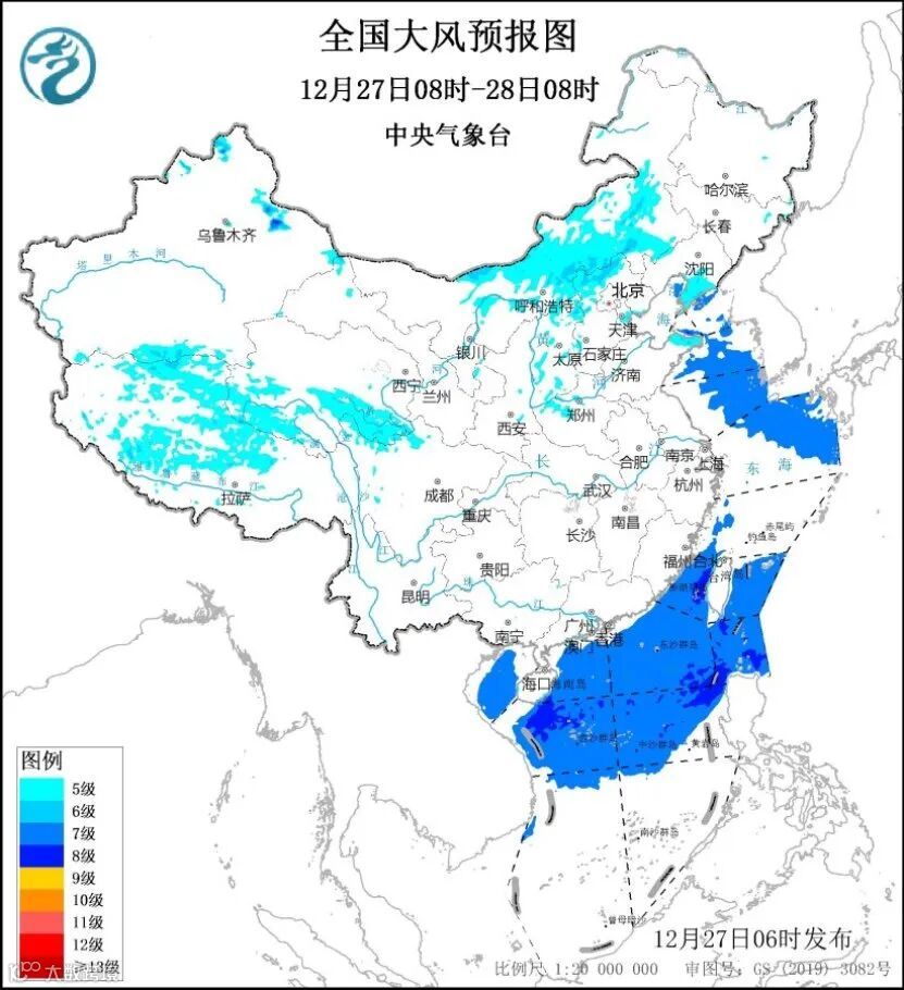 12月26日14时至27日02时,黄海大部海域出现了5~6级、阵风7级的西北风,东海大部海域、台湾海峡、台湾以东洋面、巴士海峡、南海北部海域、北部湾、南海中西部海域、南海西南部海域出现了5~7级、阵风8级的东北风或偏北风。