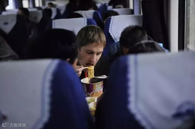 △2012年1月,一位外国人和大多数中国旅客一样,午饭吃方便面喝矿泉水。