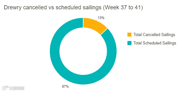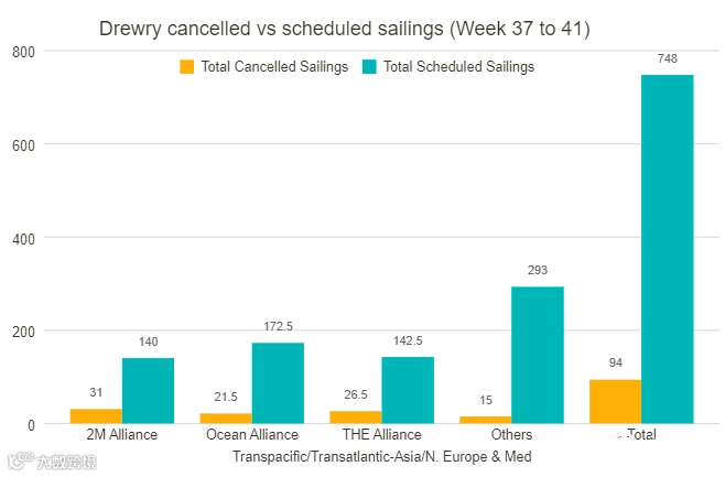 接下来的5周(第37-41周)里全球三大航运联盟陆续合计取消了89个航次。其中取消航次最多的是2M联盟达到31个航次;THE联盟达到26.5个航次,最少的海洋联盟也取消达21.5个航次。