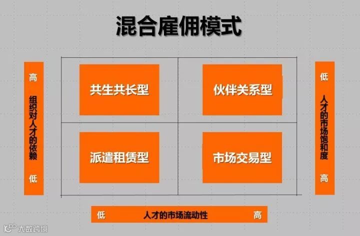 如果你对这个人才很有依赖性,但市场流动性非常大,他很容易去转换自己所隶属的组织,另外人才市场属于紧缺状态时,他在你的企业中就很可能会产生不稳定的因素,所以你会希望他成为你的伙伴,这个伙伴关系可以是企业内部共享的,比如合伙人制,或者是外部长期合作的自由职业者。